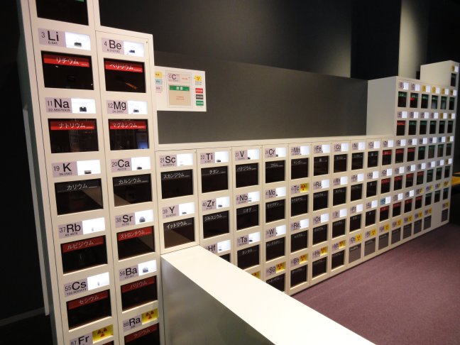 | 3Fは「身のまわりの科学」のフロア 写真下左は、元素記号表に並べた箱の中に、元素の現物やその利用製品が展示されている。 写真下右は、二重振り子の動作を確認できる。複雑な動きをしながら、二重振り子によって中々動作が止まらない・・ |