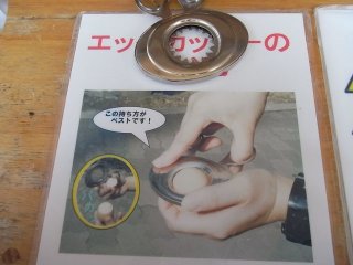 | 元湯の隣の店では温泉玉子を自分で作れる。 生卵を網に入れて、時間を計って引き上げ、専用のエッグカッターで上1/3の殻を切り取る。 |